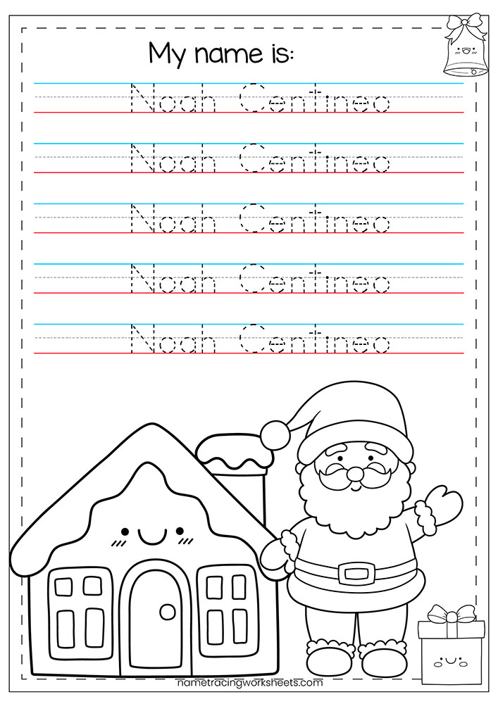 Santa Claus Name Tracing is a fun, editable name worksheets where students can type their first and last name before printing. The name appears in large, traceable letters (often with dotted lines), helping children practice letter recognition, correct stroke direction, and fine motor skills in a cheerful Christmas theme.